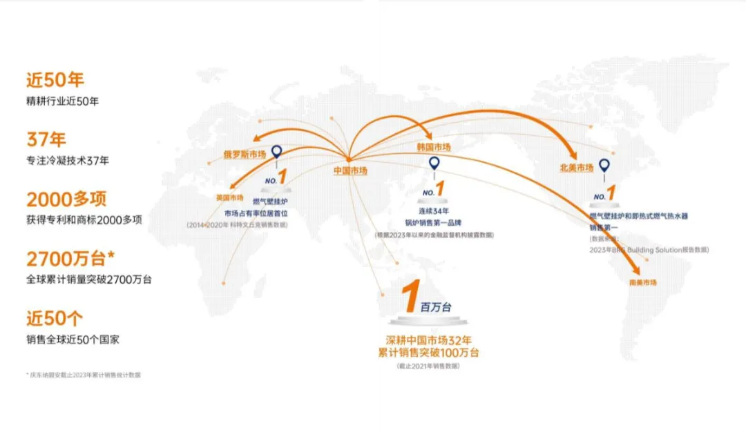 當(dāng)前,慶東納碧安已建立起橫跨亞洲、歐洲、北美的多元化市場(chǎng)體系,在全球擁有8個(gè)海外法人,產(chǎn)品出口近50多個(gè)國(guó)家與地區(qū),覆蓋超2700萬(wàn)終端用戶。以壁掛爐與熱水器為核心,慶東不斷拓展包括全屋凈水、空氣源熱泵、HVAC系統(tǒng)等在內(nèi)的多品類矩陣,服務(wù)于住宅、商用、工業(yè)等不同場(chǎng)景的空間溫控需求。全球化+全品類雙引擎,正成為慶東構(gòu)建長(zhǎng)期競(jìng)爭(zhēng)優(yōu)勢(shì)的重要支點(diǎn)。