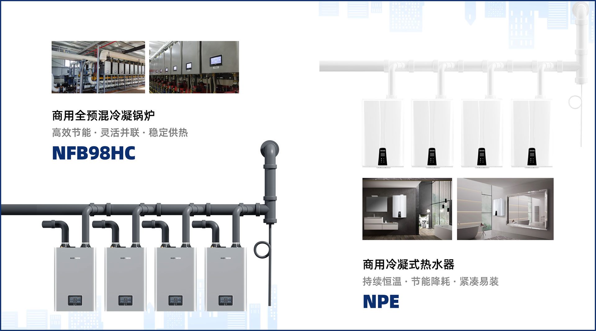 商用市場(chǎng)方面,NFB 98HC冷凝壁掛爐和NPE冷凝式熱水器廣泛應(yīng)用于公共建筑與綜合體。