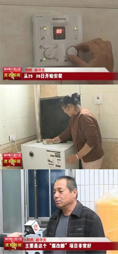慶東納碧安的落地式甲醇鍋爐MGB500早在2019年便投入山西晉中與河北威縣的煤改醇試點(diǎn)項(xiàng)目中。并且在靈石電視臺(tái)對山西煤改醇工作的采訪報(bào)道中,受訪用戶對慶東納碧安甲醇鍋爐的采暖效果十分認(rèn)可,利用當(dāng)?shù)乇容^充足的醇燃料,為當(dāng)?shù)刈魩砹耸孢m的清潔采暖體驗(yàn),有效改善了當(dāng)?shù)卮髿馕廴镜膯栴}。
