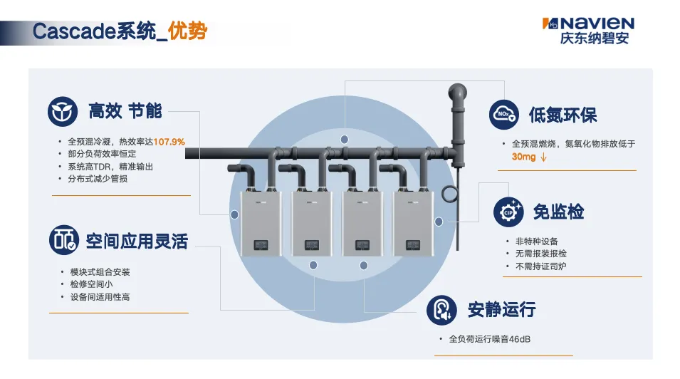 張文龍總監(jiān)在演講中介紹了慶東納碧安的Cascade并聯(lián)智控系統(tǒng)。該系統(tǒng)通過多臺全預(yù)混冷凝爐的靈活組合,實現(xiàn)了智能調(diào)控和高效運行,不僅提升了整體熱效率,更有效降低了運營能耗,充分體現(xiàn)了“高效節(jié)能”的優(yōu)勢。同時,全預(yù)混燃燒技術(shù)大幅減少氮氧化物排放,達(dá)到低碳環(huán)保要求,助力綠色發(fā)展。